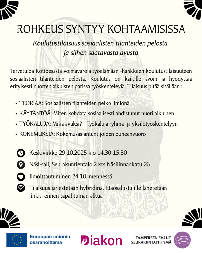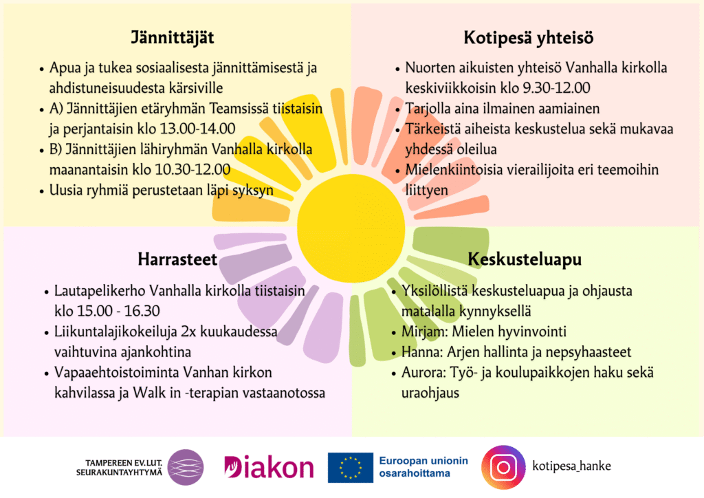 Kotipesästä voimavaroja työelämään -hanke on Tampereen ev.lut. seurakuntayhtymän ja Länsi-Suomen Diakonialaitoksen säätiön kumppanuushanke, joka toimii ajalla 3/2024 – 2/2026. Hanke on Euroopan sosiaalirahaston osarahoittama.